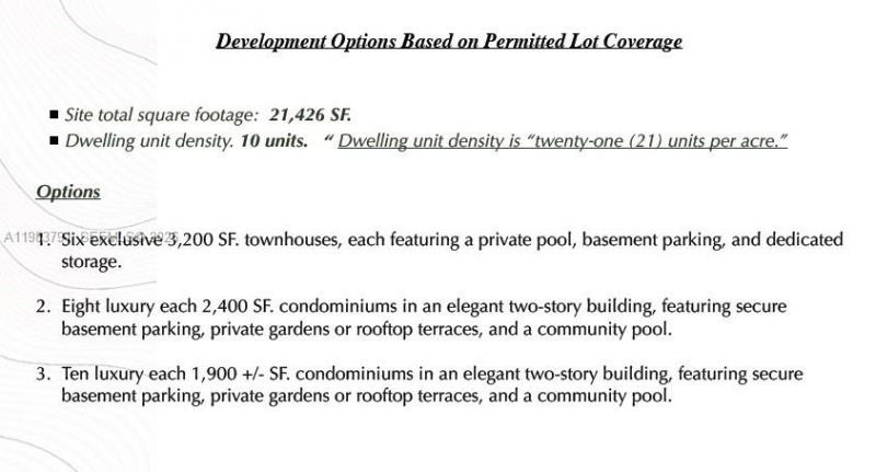 LAND DEVELOPMENT OPPORTUNITY - Huge upside through the New Development up to 10 VILLAS or T-Homes Development Options Based on Permitted Lot CoverageSite total square footage: 21,426 SF.Dwelling unit density. 10 units. Dwelling unit density is twenty-one (21) units per acre.Options 1. Six Luxurious exclusive 3,200 SF. townhouses, each featuring a private pool, basement parking, and dedicatedstorage, plus roof top with summer kitchen.2. Eight luxury each 2,400 SF. condominiums in an elegant two-...LAND DEVELOPMENT OPPORTUNITY - Huge upside through the New Development up to 10 VILLAS or T-Homes Development Options Based on Permitted Lot CoverageSite total square footage: 21,426 SF.Dwelling unit density. 10 units. Dwelling unit density is twenty-one (21) units per acre.Options 1. Six Luxurious exclusive 3,200 SF. townhouses, each featuring a private pool, basement parking, and dedicatedstorage, plus roof top with summer kitchen.2. Eight luxury each 2,400 SF. condominiums in an elegant two-story building, featuring secure basementparking, private gardens or rooftop terraces, and a community pool.3. Ten luxury each 1,900 +/- SF. condominiums in an elegant two-story building, featuring secure basementparking, private gardens or rooftop terraces, and a community pool. steps away from the beach and waterways & filling up highest and best use.Current zoning allows for multifamily use.Building is class C and B (Zoned for Multifamily) Rare opportunity for a reputable developer, fund, assets managing group to purchase an free and clear asset in Palm Beach Shores, new developments rising all over the Palm Beach shores. (attachments: some photos are renderings)